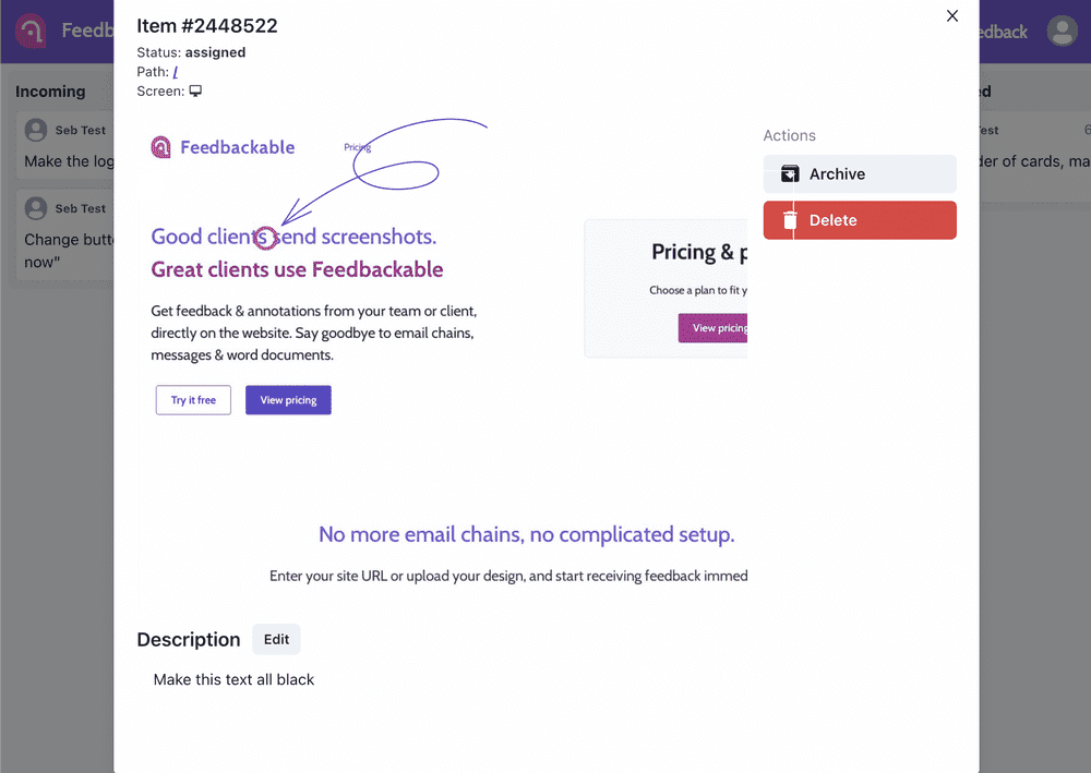 Say goodbye to email chains, word docs and messages. With Feedbackable, your whole team can see the feedback, and clients can even add items!